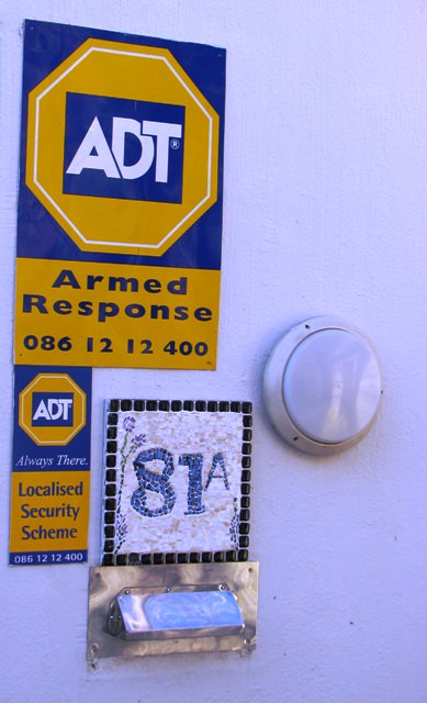 I don’t think the plant is there on purpose but it works.Interesting juxtaposition of quaint mosaic and garish security sign.I just like this one for no particular reason.