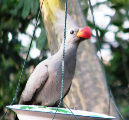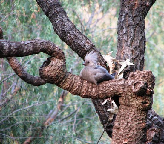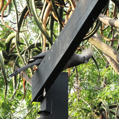 My favorites are the gray loeries, slate-colored birds with tall crests that stick straight up from their heads when they’re excited. They make a funny call that sounds like a whining four-year-old. I hear this call most often when our bird-feeder is empty.