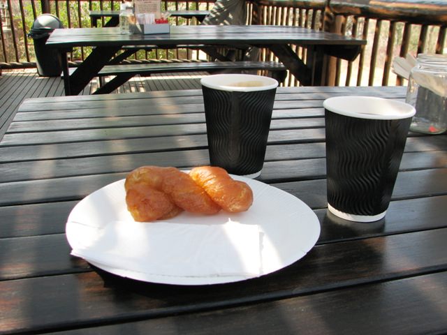 - Clarens, a resort town/artist colony on the border of South Africa and Lesotho. We stopped there at lunch time and went to a general store/coffee shop called the Purple Onion. We had coffee, rooibos tea, and something called a “koeksuster.” It’s a plaited piece of dough, shaped like a cruller, which is deep-fried in oil and plunged into an ice-cold sugary syrup. It’s an Afrikaans specialty – the owner of the Purple Onion used to make them in her grandmother’s kitchen. I estimate it contained 94 grams of fat.