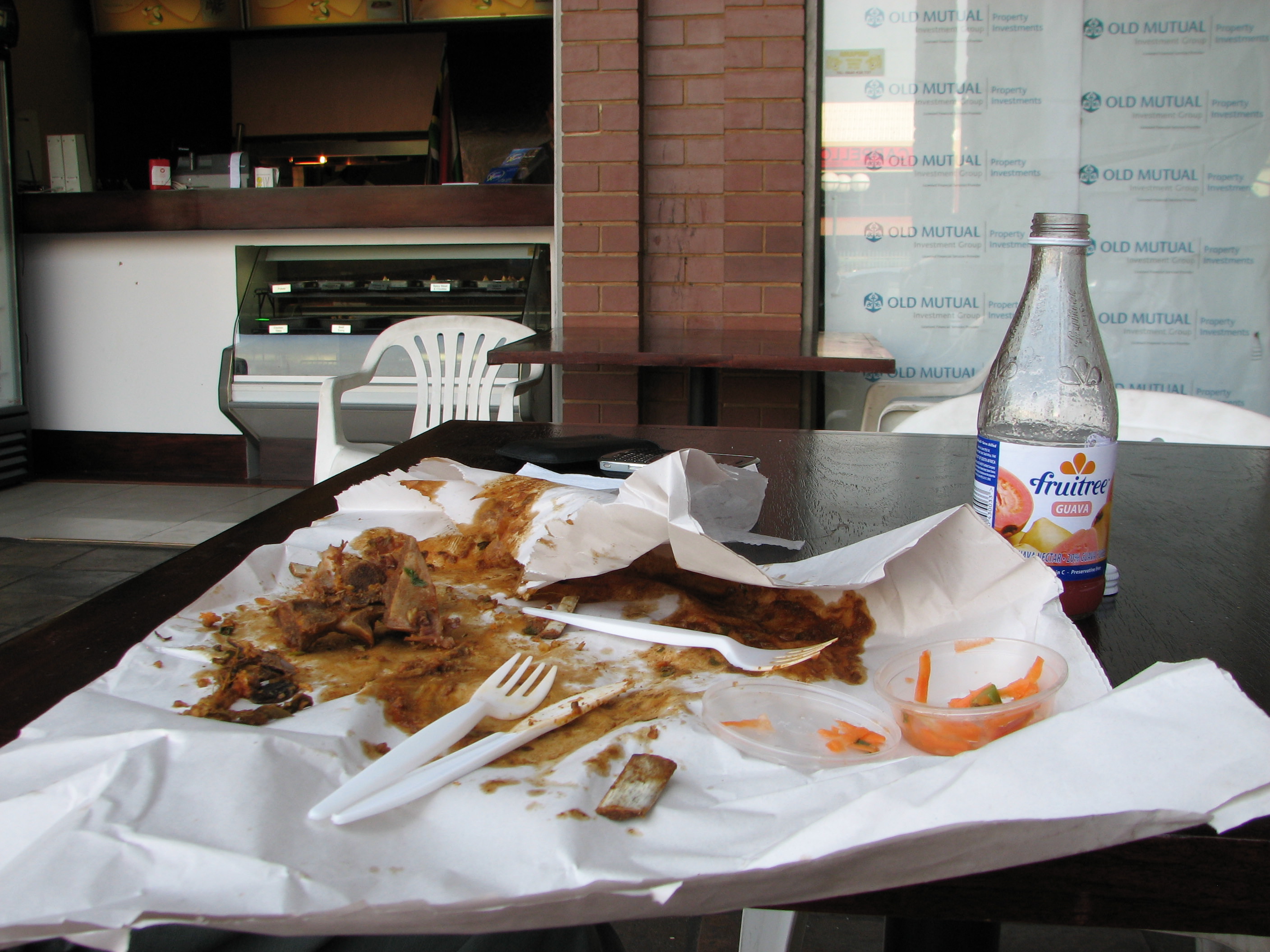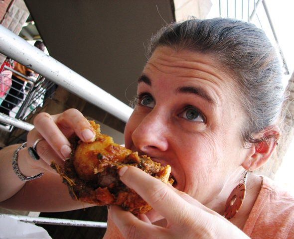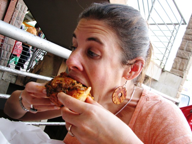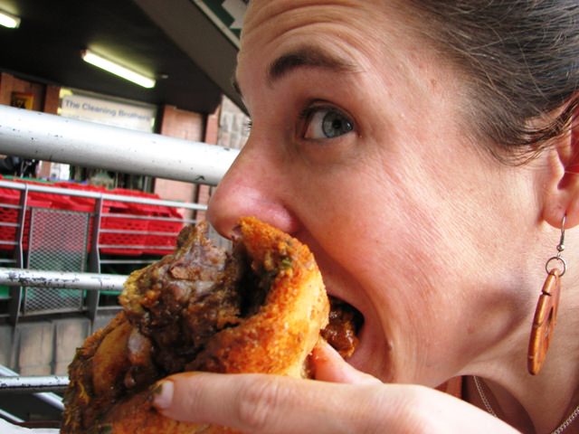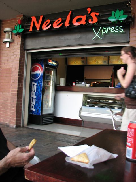 Today we got a taste of Durban in Melville, at a place called Neela’s on the second level of the Boulevard Shopping Center. It’s a tiny shop (a stand, really) that sells authentic South African-Indian fare, including 10 types of samoosas (spelled with two o’s, not one). Neela’s also specializes in the bunny chow, a spicy-sandwichy thing made only in South Africa.