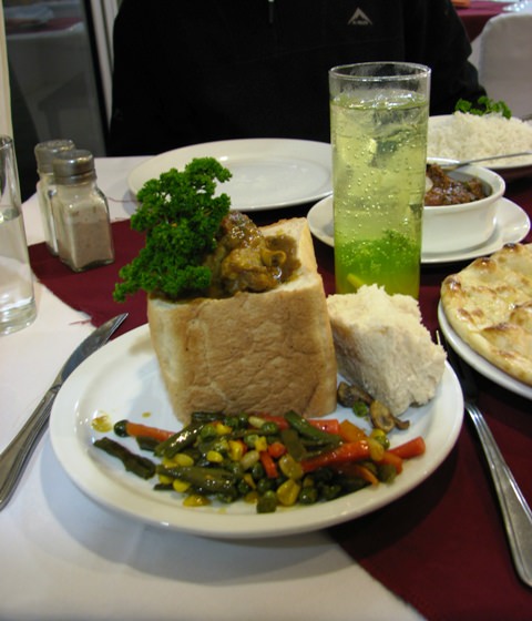 We ate our last dinner in Durban at the same place where we ate our first – Al-Mehran. I finally had a Durban bunny chow and it didn’t disappoint. It was further enhanced by a passion fruit cola – a magical concoction of passion fruit juice, cream soda (which is fluorescent green here), and lemonade, with a twist of parsley and lemon. Perfection.