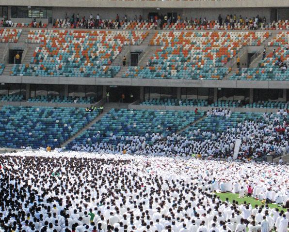 A religious service by the leader of Shembe, the Zulu Nazareth Baptist Church. Thousands of church followers knelt in the stadium infield, all dressed in white smocks. They sang hymns and blew horns that were similar to vuvuzelas, just larger and less annoying.