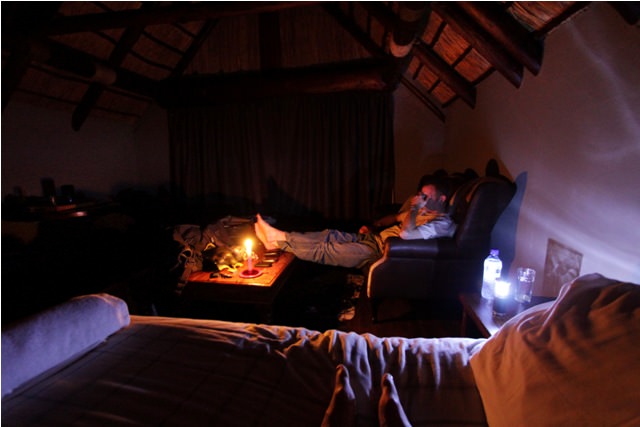 Between the flashlight, the candle, and the light on my cell phone, we could see just enough to survey the carnage. Joe was soaked to the bone and shivering. Our bag of clothes was wet but the cameras and computers seemed okay. We put on the driest clothes we could find and spread things out to dry. I made Joe some ginger tea using hot water from the tap.