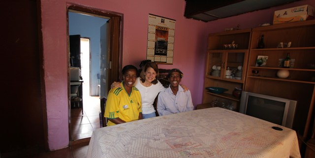 Mom with Caroline (left) and Caroline’s son Ivan (right) in their living room in Soweto.