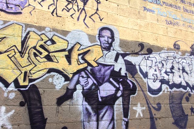 Grafitti commemorating Hector Pieterson, a 13-year-old boy who died in the Soweto Uprising. He was killed by police as schoolchildren protested Afrikaans as the medium of education in black secondary schools.
