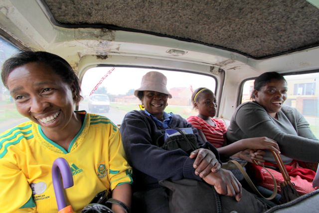 Our taxi speeds past a guy driving a horse and cart. Taxis, or informal minibuses, are the main mode of transport in Joburg. They’re usually white vans and people pack in shoulder-to-shoulder. This was my first time riding in one.The back row of our taxi. That’s Caroline on the left.