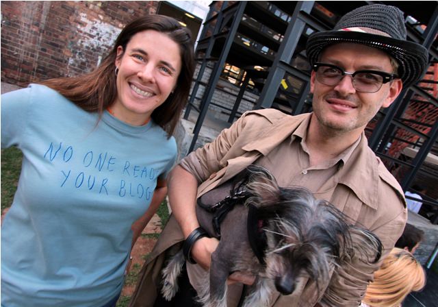Me, Jacques, and Bowtie, his Chinese Crested Terrier. Please take note of my T-shirt. I bought it in Jacques’ store at Arts on Main and thought it was fitting that we pose together for this post. Despite my recent assertion that I [suck at shopping and don’t want to accumulate stuff](/2011/02/19/pottery-shopping-with-a-rooster/ "Pottery-Shopping With a Rooster"), I had to buy this shirt for obvious reasons. Although it clearly does not apply to MY blog. (Photo courtesy of Joe.)