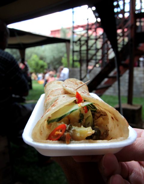 The first room in the market was crammed full of culinary delights – organic produce, baked goods, ethnic snacks, and soup in every color of the rainbow. We were instantly starved and bought the first thing that looked good – a spicy potato and brinjal (eggplant) roti wrap from the Cape Malay table. I bit into the first red chili and had to run for a bottle of water. Delicious though.
