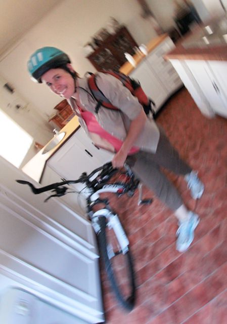 A silly photo of my departure this morning. I consider this to be my first legitimate bike commute, as I was going to an actual appointment and not just cruising to the gym or the grocery store. I looked ridiculous and my backpack was stupidly heavy. I received several honks from impatient rush-hour drivers (chill out, people) and arrived at my destination a hot sweaty mess. (I rode to the posh Crowne Plaza in Rosebank, where I deposited my bike in the hotel’s luggage holding room and caught a ride from there to Bryanston with some colleagues. It was hilarious.) Photo courtesy of Joe.