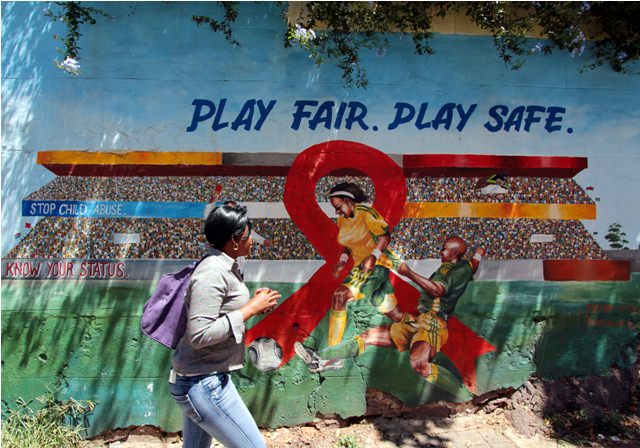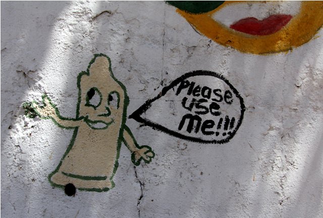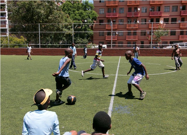 Bananas for sale – R4 per plate. I bought some and they’re excellent.The buildings in the background have been "hijacked," meaning that criminal gangs have forcibly taken them over from legitimate landlords. Tim told me that a one-bedroom flat can have a dozen or more people living in it. The tall building on the right does not have a functioning elevator. Count those fire escapes and imagine what that means.This beautiful soccer field was at the foot of the hijacked buildings. It was built before the World Cup and I’m told that Nike paid for it. The score was 1-1.According to Tim, this was once the most dangerous building in Hillbrow. If you walked past it you were guaranteed to get mugged. It was recently reclaimed from its highjackers and remodeled. Now it’s one of the nicest buildings around.Another nicely refurbished building.Vegas, baby!If you look carefully behind the woman walking by, you’ll see a "referee" in a lab coat holding up a red card. Fabulous. Seriously though, beautiful graffiti and an important message.No explanation needed.A woman and her daughter selling sweets for R1 apiece. Despite my best efforts to win her over, the daughter did not find me amusing in the slightest.The baby under the umbrella next door was another story.This photo is a placeholder. We stumbled upon the Hillbrow Boxing Club during our walk and I had a chat with the man in charge, George Khosi. Those of you who know me in real life will understand the significance of this meeting. I’ll be back, and future blogging will ensue.