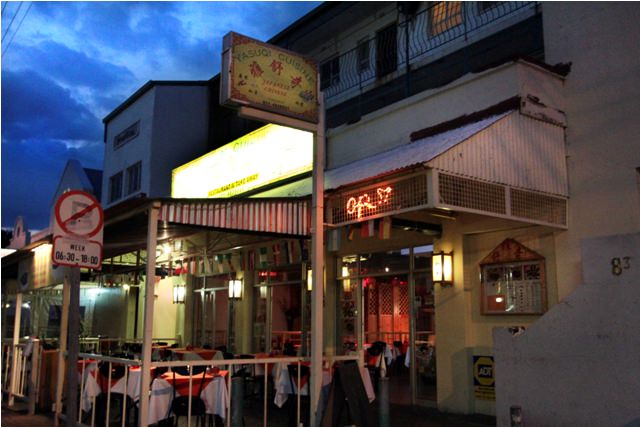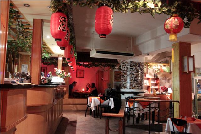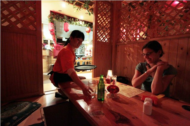 The restaurant always looks empty because no one sits at the tables in the middle. The prime real estate is along the sides – at the sunken booths surrounded by lattice-work and plastic greenery. You climb in, slide the doors closed, and suddenly you’re in your own private funky Asian cave.