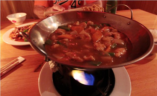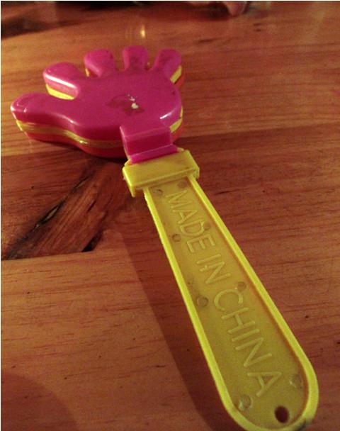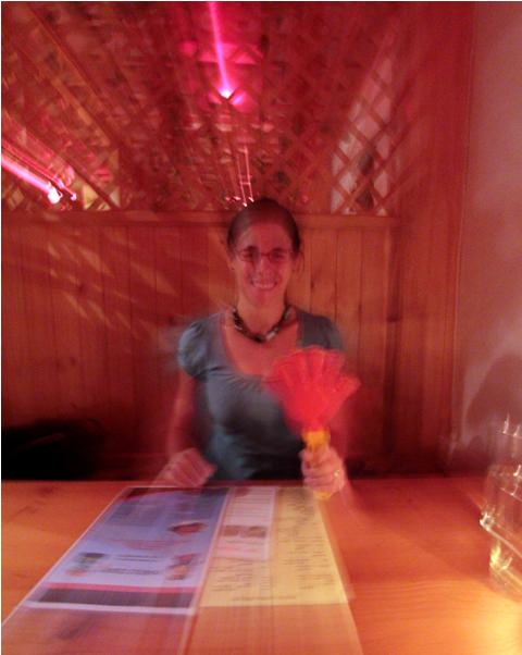 An artistic rendition of me shaking a Chinese clapper. When you’re ready to order, or you want another drink, or you’re ready for the bill, you shake the clapper (it makes an incredible racket) and the waitress materializes in seconds with a dazzling smile. I was embarrassed to do it at first, but then I got hungry and realized no one would come until I clapped. (Photo courtesy of Joe.)A closeup of the clapper. Made in China, of course.Yasuqi serves Japanese, Chinese and Thai-style dishes. The sushi is actually quite good.Every time we eat at Yasuqi I seem to order this flaming wok of "Thai" curry as my main course. I’m not sure why, as the curry is bland and the flames are hot and kind of scary. It’s like this curry has cast a spell over me. I’m determined to stick with sushi next time.