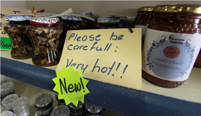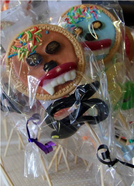 These women have both been with Koljander for more than 20 years.Toys."Lekker," pronounced something like "LEH-cker," is my favorite Afrikaans word. It means cool, awesome, or kick-ass. (Read a post by Lisa at Notes From Africa about the phrase "Local is Lekker.") I’m not sure diabetic apricot jam can be lekker (sorry, diabetics), but I did buy some homemade quince jam. Haven’t tried it yet but I have high hopes.Lots and lots of rusks. Rusks are dry biscuits, traditionally made from stale bread, which South Africans eat with tea or coffee. Rusks come in whole wheat, raisin, muesli, and several other flavors. (Joe had to translate most of the flavors because they were written in Afrikaans.) I chose a package of orange poppyseed.Do not touch this jar of pickle. It might burn you.These all look delicious but I haven’t found an occasion worthy of buying one yet.The scariest, most lekker cookie pop I’ve ever seen. I do believe there is a licorice gummy snake coiled around the stick.