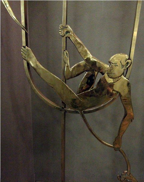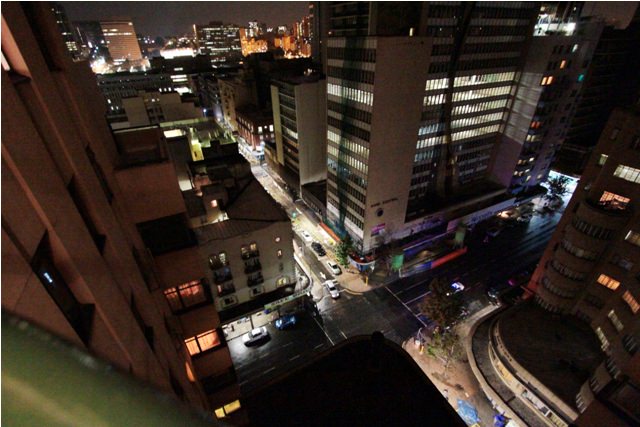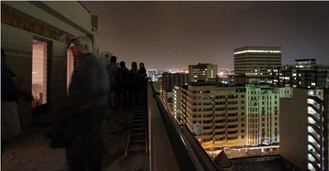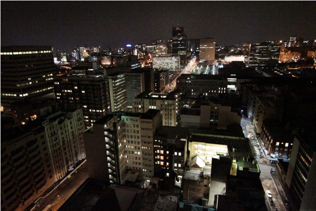 The lobby of the Ansteys. It has crazy tiles and brass monkeys.Close-up of the monkey.Balcony on the 16th floor.It felt like being in New York City, only the buildings weren’t quite as tall and it was quiet – no honking. There’s very little traffic in this part of town at night.From the roof. The brightly-lit blue building is in Braamfontein and used to belong to South African Airways. Not sure what it is now.