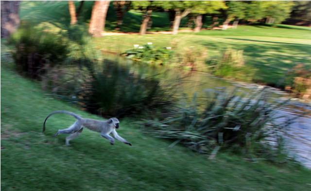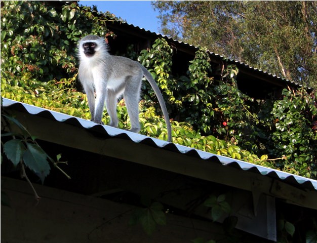 Sculptures appear to stroll the grounds at NIROX.An artistic installation in the main house at NIROX. The previous artist in residence at the house, Geoffrey Hendricks, had just left and the new artist hadn’t arrived yet.We went from the main house to the cottage, where the other artist in residence lives and works. The current cottage resident is Steve Bandoma, a young artist originally from Congo – this is one of his works. Steve wasn’t there when we arrived; we felt a little strange taking pictures without him there, even though the staff had notified him we were coming and said they were sure he wouldn’t mind.There were dozens of monkeys cavorting around Steve’s cottage – on the roof, on the patio, peering through the windows, etc. Those creepers have berries on them that monkeys love to eat.There were so many monkeys.Dancing rabbits or dancing impala? You be the judge.Another view of the strolling sculptures.