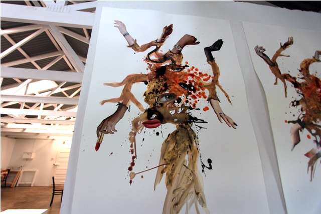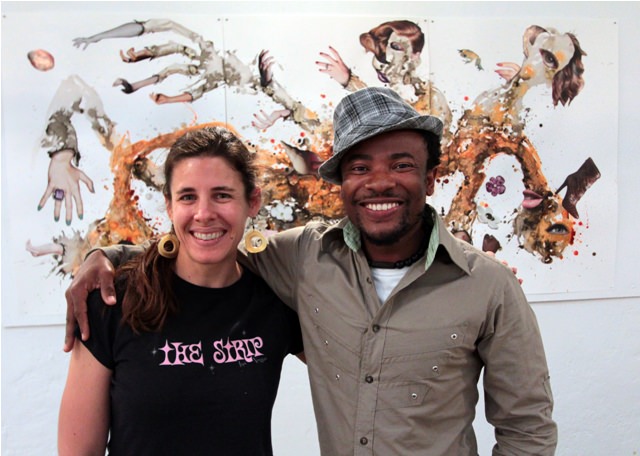 We watched Steve work for a while and he talked to us about his art. He’s currently working on mixed-media pieces – a combination of painting and collage. It was exciting to look at these magazine ads, wrappers, and bits of paper and imagine that they will eventually become works of art. "Art is not about culture," Steve said. "It’s about personal state of mind."Steve and I in front of one of his favorite works. Steve told us that he’s proud to be "the first young, black, African artist" to live at NIROX. (Photo courtesy of Joe.)