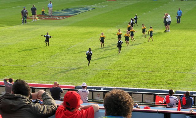 Eight lucky boys’ rugby squads got to go out on the field and compete before the match. No shoes allowed, presumably to protect the turf. This young man is scoring a "try" – the equivalent of an American football touchdown.