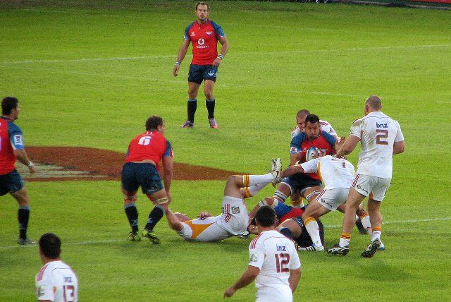 Last night the Blue Bulls of Pretoria (officially called the Vodacom Bulls, but I’ll get to that later) took on the Chiefs of Hamilton, New Zealand, in a Super Rugby match. Super Rugby is a conference comprising 15 professional teams from South Africa, Australia, and New Zealand. The Super Rugby champion is officially the best rugby team in the Southern Hemisphere; the Bulls were the Super Rugby champs last year. There is also a Joburg-based Super Rugby team, the MTN Lions, which is the worst team in Super Rugby.