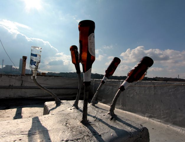 We started our walk at the Troyeville Hotel, which is actually not a hotel but a restaurant. Troyeville is a historically poor white neighborhood on the edge of downtown. The Troyeville Hotel is famous for its quirkiness and delicious Portuguese-Mozambican food. I’ll have to write a longer post about it someday in the future.We got special permission to go up to the roof of the Troyeville Hotel, which has a nice view of the city skyline. I was more interested in this beer bottle sculpture though.