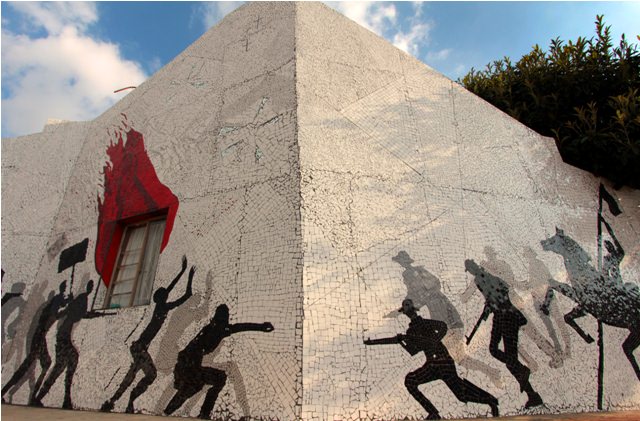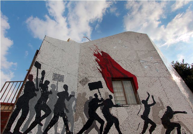 Every home in Bertrams has at least one dog. When I walked past this house, the dog ran up to me and wagged her tail. I asked her elderly owners if I could take a photo. The dog went into full attack mode as soon as she saw the lens. I guess she’s camera-shy.Mail slot to nowhere.We came upon this beautiful mosaic on the edge of Bertrams.The story continues on the adjoining wall.
