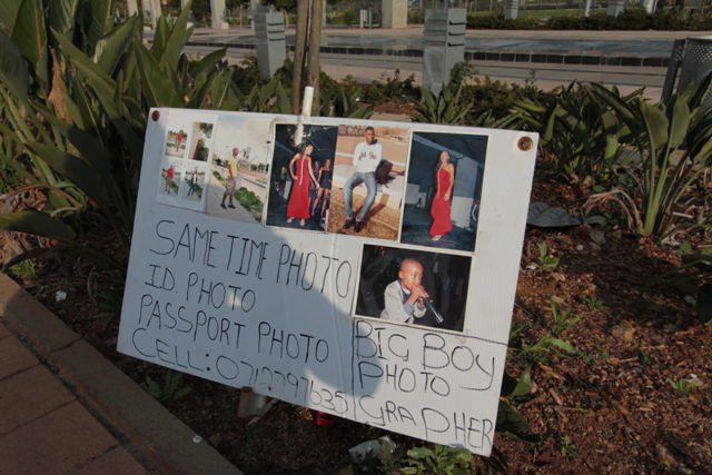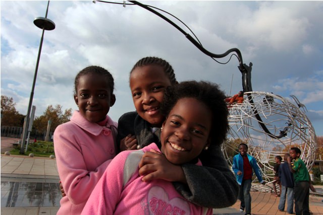These guys make a living taking photos of people and selling the prints for R10 (about $1.50) each. I’ve noticed several similar operations in parks and public places around South Africa. I asked them for a job and they laughed at me.Ad for the photography business. I’m not sure why they call it "Same Time Photo" because they have to take the photos to be printed at a camera shop.There’s a cool soccer-ball-shaped sculpture outside Ellis Park. By the time I got there, the ball was crawling with children and Photowalkers photographing the children. I decided to hang back and give my camera a break. As everyone walked off, these girls ran up and asked me to take one more picture.