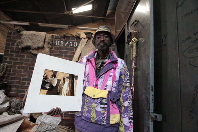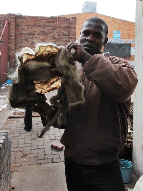 We came upon a man chopping roots in the afternoon sun. We asked his boss if we could take photographs and she told us it would cost R20. After we paid up, the chopping guy said he wanted an additional R20 to be photographed in the act of chopping. When we said no, he stopped chopping and walked away.That’s the cranky non-chopper on the right. The brown wreaths are made of wild sage, which people burn in their homes to cleanse the air. It smelled wonderful. The tower in the distance is the [Carlton Centre](/2011/03/03/jozi-from-above/ "Jozi From Above"), the tallest building in Africa.This guy asked me to photograph him as I walked past. Joe says this is a baboon skin.The skin of a very large African python, surrounded by cowrie shells and other sundries.