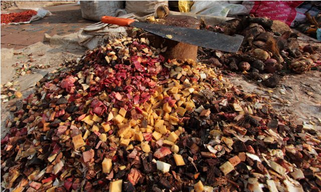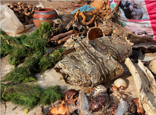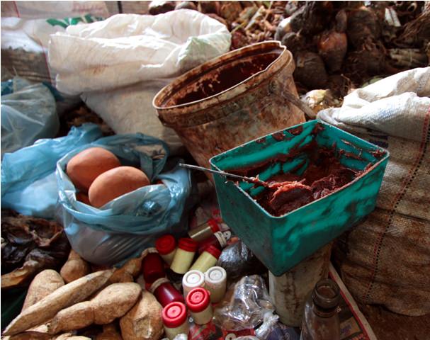 A selection of products at one of the market stalls. Each stall sells dozens of powders, plants, pastes, and parts. The brown paste in the green container is female lubricant – a traditional version of K-Y jelly.