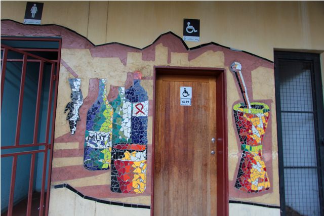I’m not sure what kind of bird this is, or what it’s for. Michael told me it costs R120 for the head or R200 for the whole bird. Jeaniene says the animal parts are generally ground up into powder and consumed in liquid form.When it first opened, artists were commissioned to create murals and other artwork around the permanent market site. Traditional healers are often criticized for advising HIV-positive patients to use traditional medicine in place of antiretroviral treatment. This mural suggests the two can work together – I hope the message gets through to the people using the toilets.