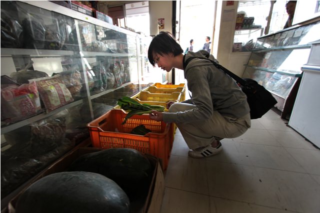 Photowalker Karen, who is of Chinese descent herself, casts an expert eye over the bok choy in this shop. (By the way, Karen has a fun blog called the Story of Bing.)Local wildlife.A cute kid eyes us suspiciously from his parents’ shop on the edge of Old Chinatown. (Photo courtesy of [Joe](/about-joe/ "About Joe").)