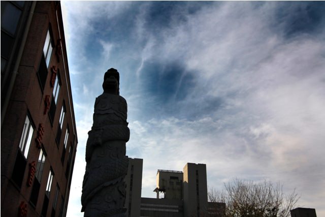 One of two concrete statues on Commissioner Street, erected last year to welcome visitors to Old Chinatown.An Old Chinatown shop topped by an art deco apartment block.