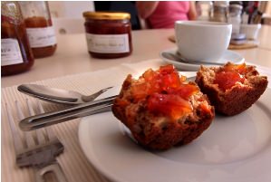 Muffins and jam at Melville Manor. I had an apple and carrot muffin with pawpaw, pineapple, and ginger jam. Jane Widdop, the owner of Melville Manor, is in the background.