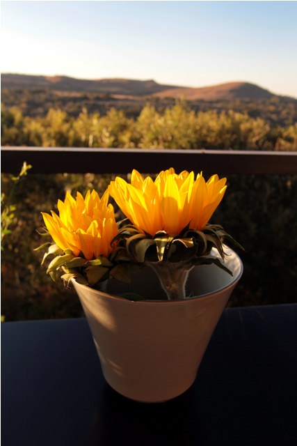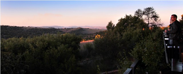 After a quick sandwich at the reserve, we made our final stop at the Cradle Restaurant, reportedly one of the best places to eat in Gauteng Province. We couldn’t afford a meal at the Cradle, but we went anyway for the view. Chris and I had tea and John ordered a Castle lager. We watched the sun go down and enjoyed a stunning view, which has changed very little since the beginning of human history.