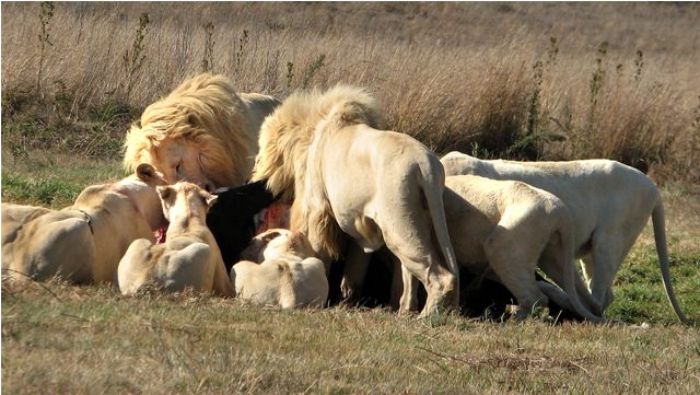 The white lions were last to be fed. White lions, which carry a rare recessive gene that causes their color, exist mostly in zoos and nature reserves, where they are bred specifically to create more white lions. (White lions are considered divine by some traditional cultures.) This practice has caused inbreeding among white lions, but the ones we saw feeding here were healthy.