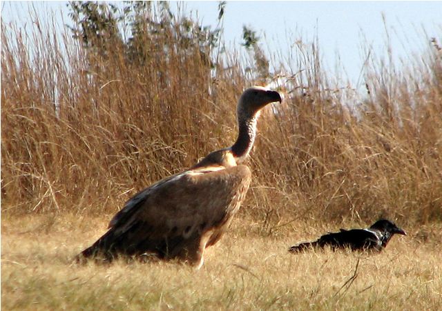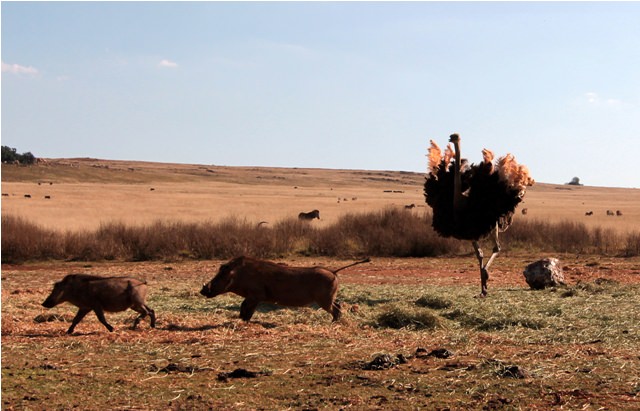 Scavengers: An immature Cape Griffon Vulture (he may look huge, but the downy feathers on his neck mean he’s a just a youngster) and a crow hang around the remains left by the wild dogs.The ostrich did not want to share her food (a type of grass called lucerne, left by the keepers) with these cheeky warthogs.