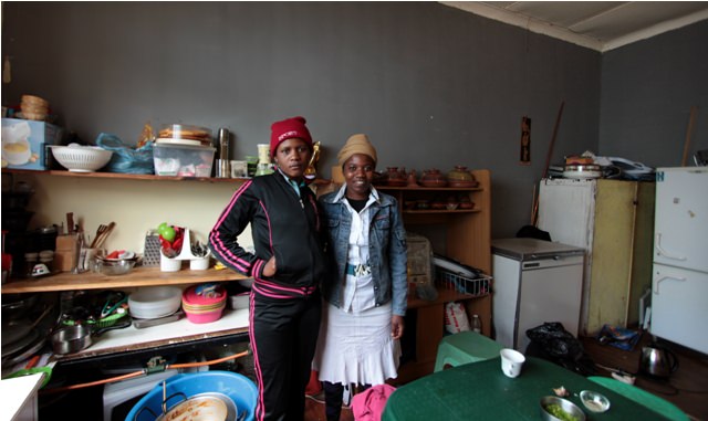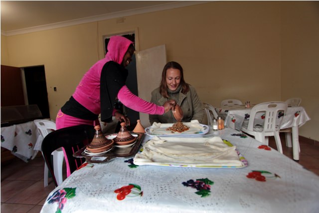 Blue Nile doubles as a phone card shop.Caitlin prepares to chow. There was one item on the menu at Blue Nile that day: meat. Tasty meat with onions, spices, and fresh chilies, served over injera with a side of hot black tea. It was good. The bill came to R85 for three – about $4 a person.Blue Nile staff in the restaurant’s kitchen.