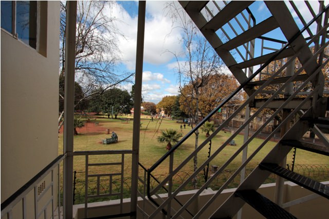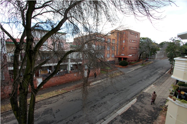 View from the stairwell of Caitlin’s building. There’s a flat for sale on her floor – holler if you’re interested. Yeoville real estate is a steal.View from Caitlin’s front balcony. Across the street is a "squatted" building (unseen), which is occupied mostly by families. Catty-corner is what Caitlin politely called "an establishment of the night" (also unseen).