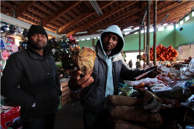 Daniel runs a food stand in the market. He’s serious about his okra. Check out the plaid bags on the right. More on those later.Daniel shows us a fish head for sale. I hear they’re great in soup. Those giant brown tubers are yams.