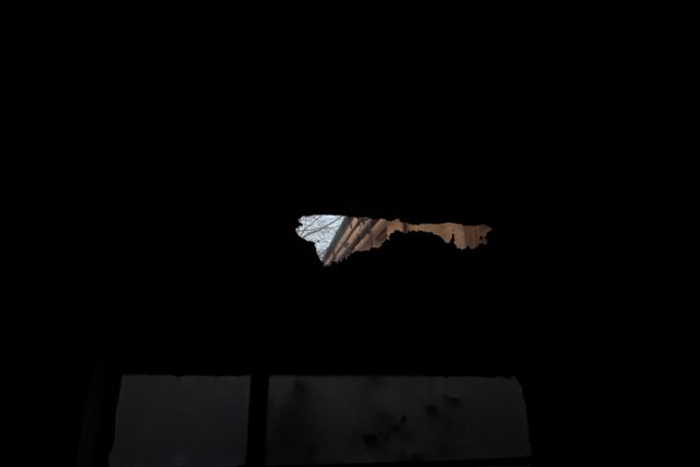 View from the front of the old hospital’s main building, built in 1937.Inside looking out: a random hole in the wall of the main hospital building.Another view from inside the main building.An abandoned chapel on the hospital grounds. There was garbage piled up against the door so we couldn’t get inside.This dilapidated house used to belong to the hospital superintendent. The yard has become a well-tended vegetable garden, perhaps used by the health precinct staff. I was intrigued by the old apartment building behind the house, which has what look like solar panels on its roof.
