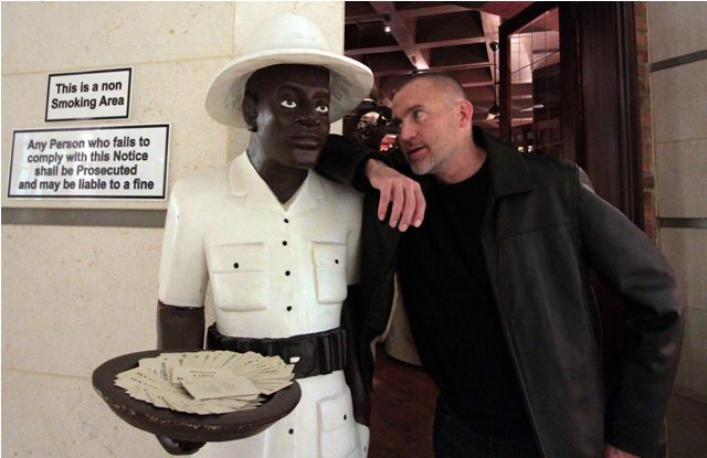 Joe chats with another un-politically-correct statue at the Grillhouse entrance.