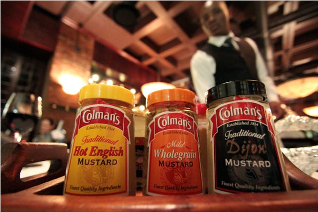 Joe looks bewildered by the amount of food on the table. You can’t tell in this bad photo, but his prime rib was twice the size of my hand.The steaks were accompanied by a "mustard tray," with six different mustards and sauces. The Hot English Mustard was my fave. (Photo courtesy of [Joe](/about-joe/ "About Joe").)