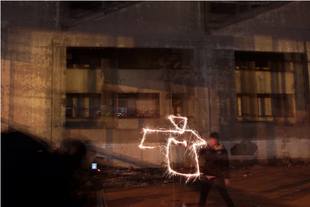 We gathered at sunset in the parking lot of the Sci-Bono centre in Newtown. The group headed across an empty field and under the M1 highway, to an industrial area filled with crumbling warehouses and garbage.