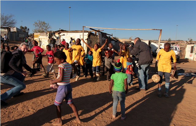 Soccer players celebrate a goal as [Joe](/about-joe/ "About Joe") and Darren take pictures. The team in yellow was called the "Mandela Stars."