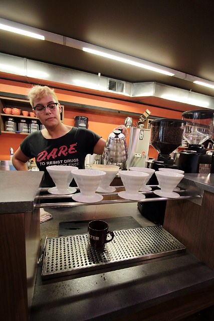 A skilled barista brews me a single cup of Ethiopian Sidamo. Filter serves single-origin coffees from around the world, roasted locally in Annapolis, Maryland.