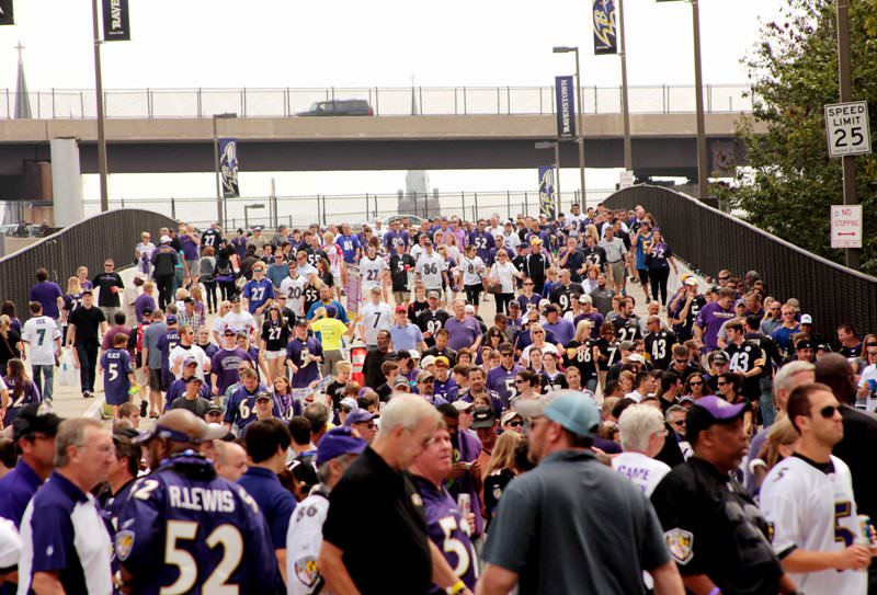 A sea of purple-clad fans pours down a Baltimore overpass, ready to enter M&T Bank Stadium for the first game of the season.
