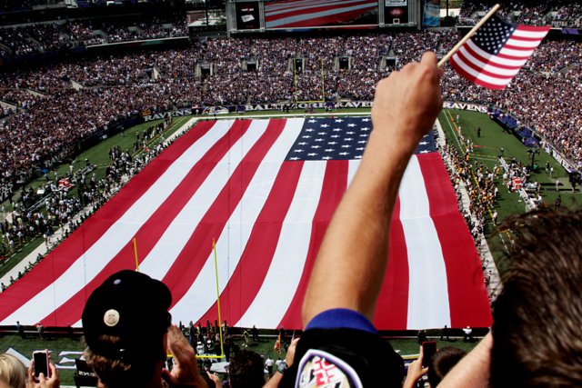 A football-field-sized flag is unfurled in the stadium during the opening ceremonies. Similar ceremonies took place at all the other NFL stadiums around the country.