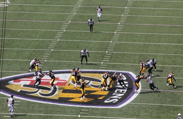 That’s my team in white. The guy in the middle of the field, #52, is Ray Lewis, one of the greatest linebackers of all time. He’s like a god in Baltimore – I admit to worshipping him myself. There’s a great Ray Lewis video in my old post about rugby, if you’d like to check it out.