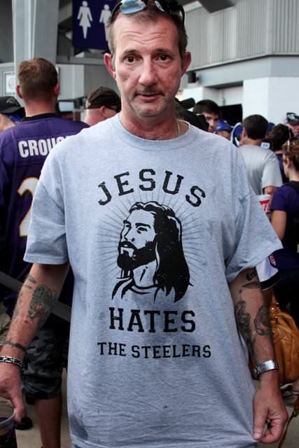 This is ‘Tater’, the mascot of section 512 in M&T Bank Stadium. One of the great things about football is that most of the seats are owned by season ticket holders, so you sit with the same people every week. Tater has been at every Ravens game I’ve attended for the last 14 years. He high-fives every fan in the section before leaving each game. Can you see the pure joy on is face? This victory made Tater’s entire year.I usually feel that it’s unsportsmanlike to insult your opponent rather than supporting your own team. But this shirt is really funny. I asked the guy where he got it but he was too drunk to form a complete sentence.