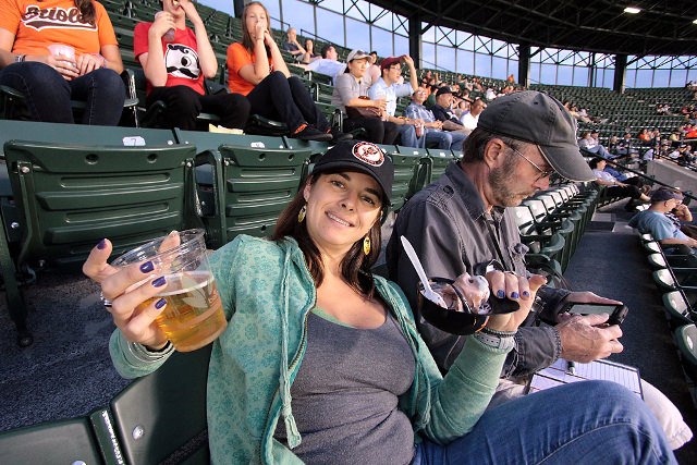 Susanna enjoys a Natty Boh (local Baltimore beer) and an ice cream sundae in a plastic baseball helmet. Dad checks his email.