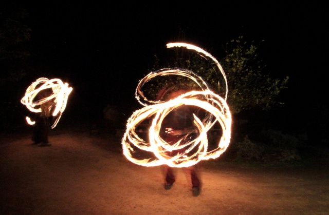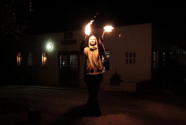 We feast on Thai-style cottage pie prepared by a Scottish cook named Stew. After dinner we’re treated to an impromptu fire-dancing show.