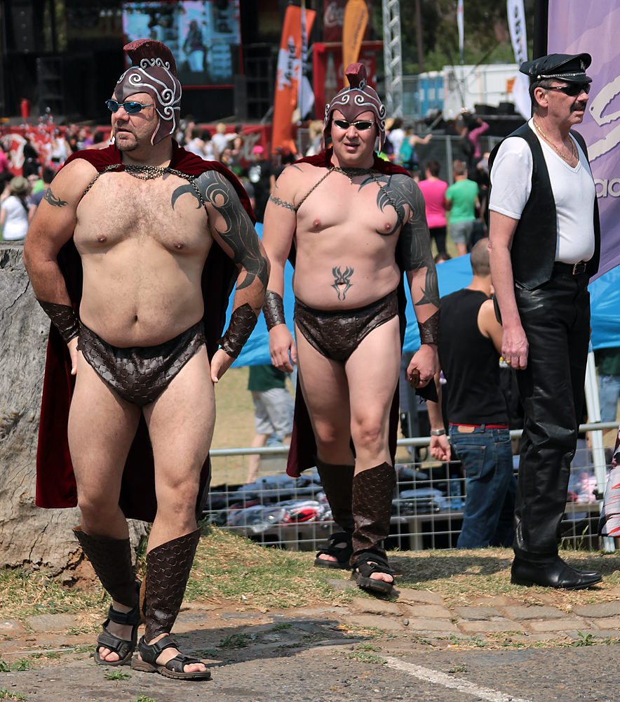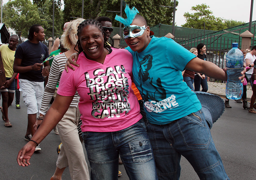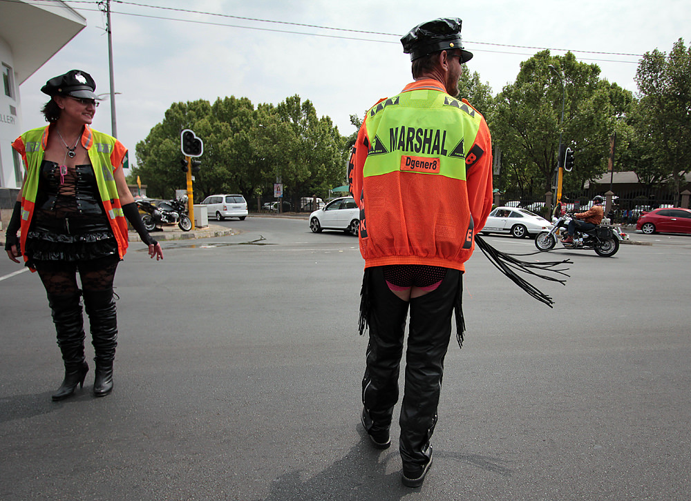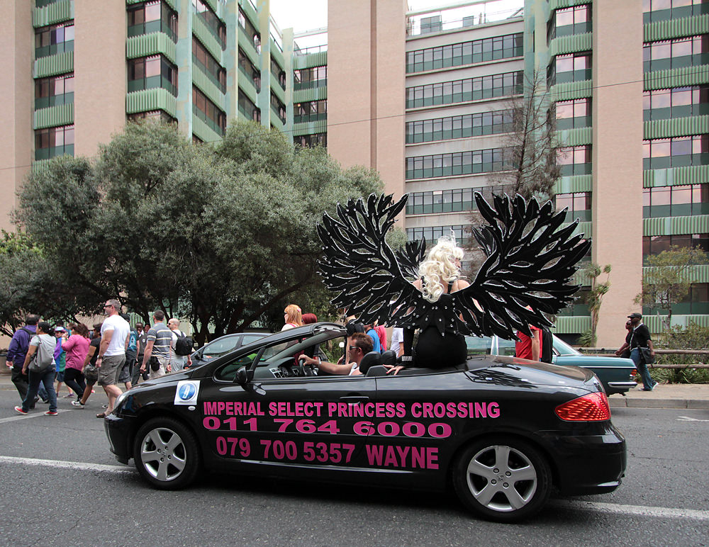 Most of the couples at gay pride wear matching outfits, which makes for good photography.A participant is painted with the tagline of this year’s Joburg Pride.A ‘fag hag’ is an inappropriate term for a girl who hangs out with gay guys. I’m a bit of a fag hag myself.No explanation necessary. Just awesome.My favorite shot of the day.I initially thought ‘Imperial Select Princess Crossing’ must be a drag queen escort service. Turns out it’s a car dealership. [Note: I am totally joking and the people on board are not escorts.]Her T-shirt reads: ‘I can do all those things your boyfriend can’t.’Nice advertising for gaychurch.co.za. I checked out the site but it’s all in Afrikaans.The Joburg Pride marshalls, who protected us from the Jozi traffic, look like cops at first glance. But if you look closely you can see that they quite obviously are not. Click on the photo for a closer look.